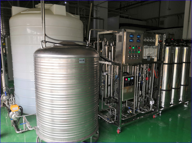 源水箱→源水增壓泵→多介質過濾器→活性碳過濾器→陽樹脂軟化器→精密過濾器→一級RO反滲透純水系統→二級RO反滲透純水系統→水氣混合器→臭氧殺菌機→不銹鋼純水罐→恒壓輸送系統用水點