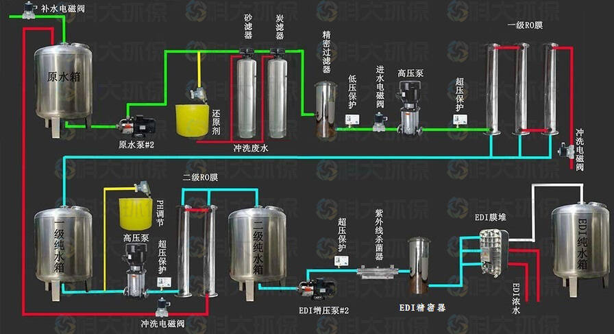 | 二級RO+EDI | 電阻率≥15MΩ·cm | 適合:對電阻率要求穩定在15兆歐以上的超純水; 優點:產水質穩定性高、EDI壽命較長 缺點:投入成本高、耗能多 |