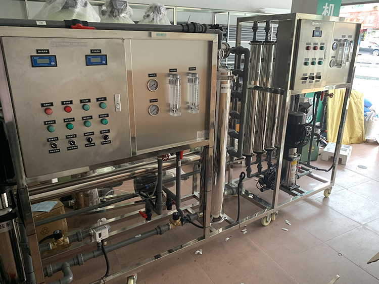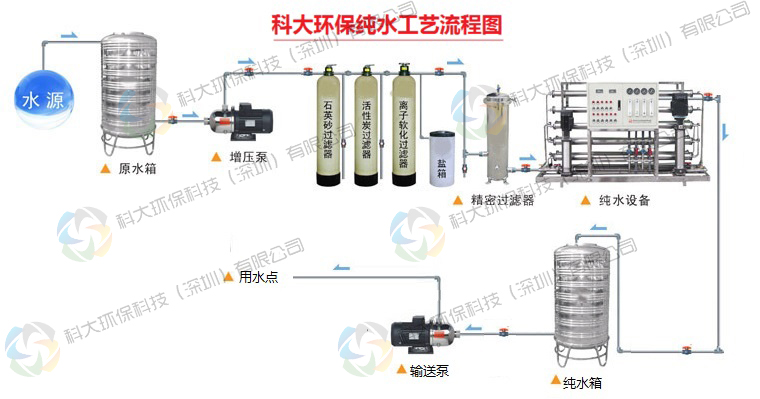 自來水---->原水箱---->供水泵---->多介質過濾器---->活性炭過濾器---->軟化過濾器---->保安過濾器---->高壓泵---->反滲透機組---->純水箱---->恒壓輸送系統---->用水點
