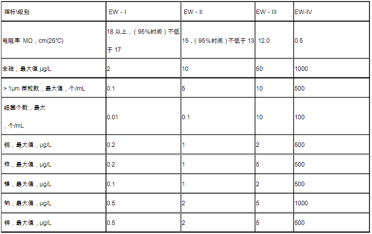 目前,我國電子工業部把工業超純水水質技術分為五個行業標準(GB/T 11446),分別為18MΩ.cm、15MΩ.cm、10MΩ.cm、0.5MΩ.cm,以區分不同水質。制備超純水的辦法一般選用反滲透設備,去離子或電去離子(EDI)等工藝。在水質要求達10MΩ.cm以上,一般選用不同的工藝進行組合調配的辦法來制取,例如選用反滲透加去離子,反滲透加EDI等。
