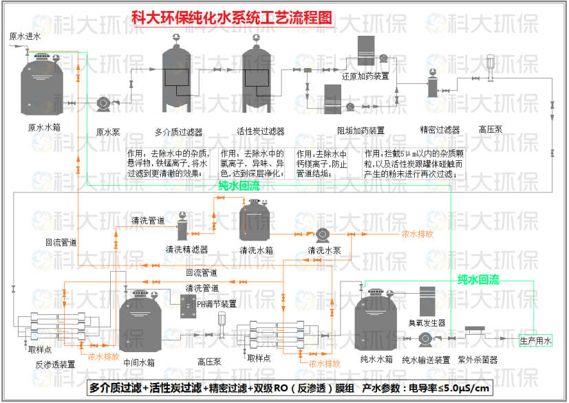 原水→原水泵→多介質過濾器→活性炭過濾器→阻垢加藥裝置→還原加藥裝置精密過濾器→一級高壓泵一級級反滲透 →PH調節→中間水箱→二級高壓泵二級反滲透(反滲透膜表面帶正電荷)→純化水箱→臭氧發生器純水輸送泵→紫外線殺菌器→用水點